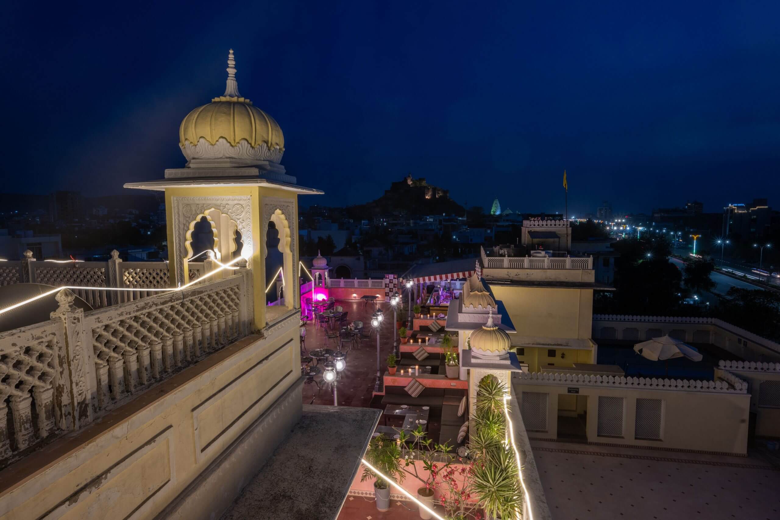 This picturesque rooftop lounge of is Grand Uniara offers you the ideal setting for a beautiful evening. Sit here to share a meal and a drink with friends or family while watching the striking view of the nearby Moti Dungri temple.