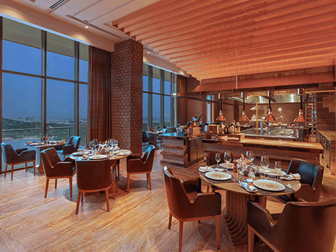 Luxury bar with the finest selection of premium beverages overlooking the skyline of Hyderabad.
