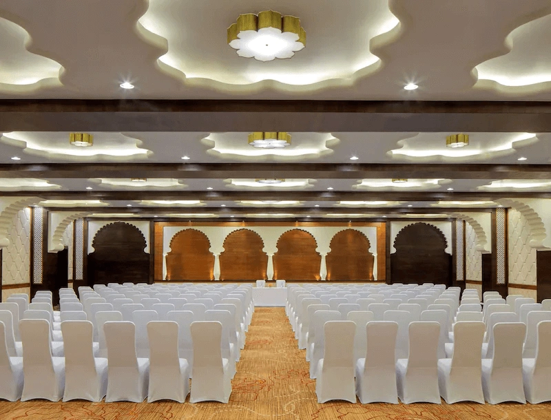 Radisson Jodhpur is a contemporary hotel located in the heart of the city. Radisson Jodhpur is a contemporary hotel that offers a perfect blend of elegance and sophistication. The hotel offers multiple indoor and outdoor venues, including a grand ballroom and a lush garden. The hotel's modern decor and amenities make it an ideal wedding destination for those who prefer a contemporary style. With Fiestro as your wedding planner and decorator, you can create a unique wedding experience that perfectly reflects your personality and style. Our team will help you choose from a range of decor options, including floral arrangements, lighting, and centerpieces, to create a stunning ambiance that will leave a lasting impression on your guests. The Fiestro team can help you create a decor that reflects your personal style and preferences. From the floral arrangements to the lighting, every detail will be taken care of. Our team will ensure that your wedding day is a memorable experience for you and your guests, with impeccable service and attention to detail.